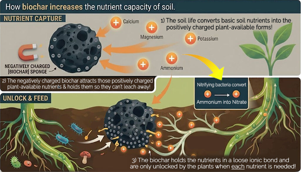 But biochar also acts as a permanent magnet for ATTRACTING plant-available nutrients, and its porous structure holds them so they CAN’T leach away!